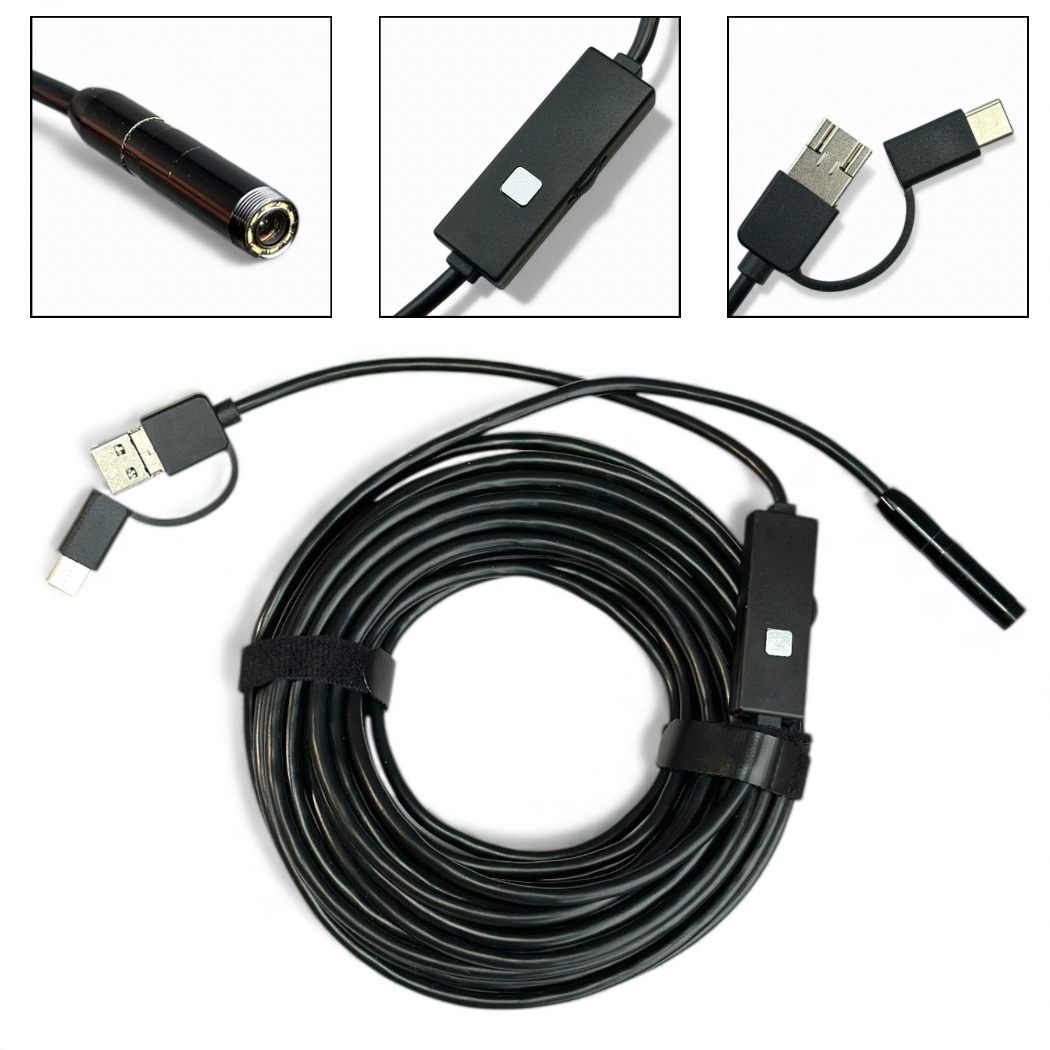 Данное устройство можно подключить к смартфону, планшету, ноутбуку или компьютеру с помощью разъемов Type-C. Такой эндоскоп представляет собой видеокамеру на гибком кабеле, которая транслирует видео на экране смартфона, планшета, ноутбука или ПК в режиме реального времени.