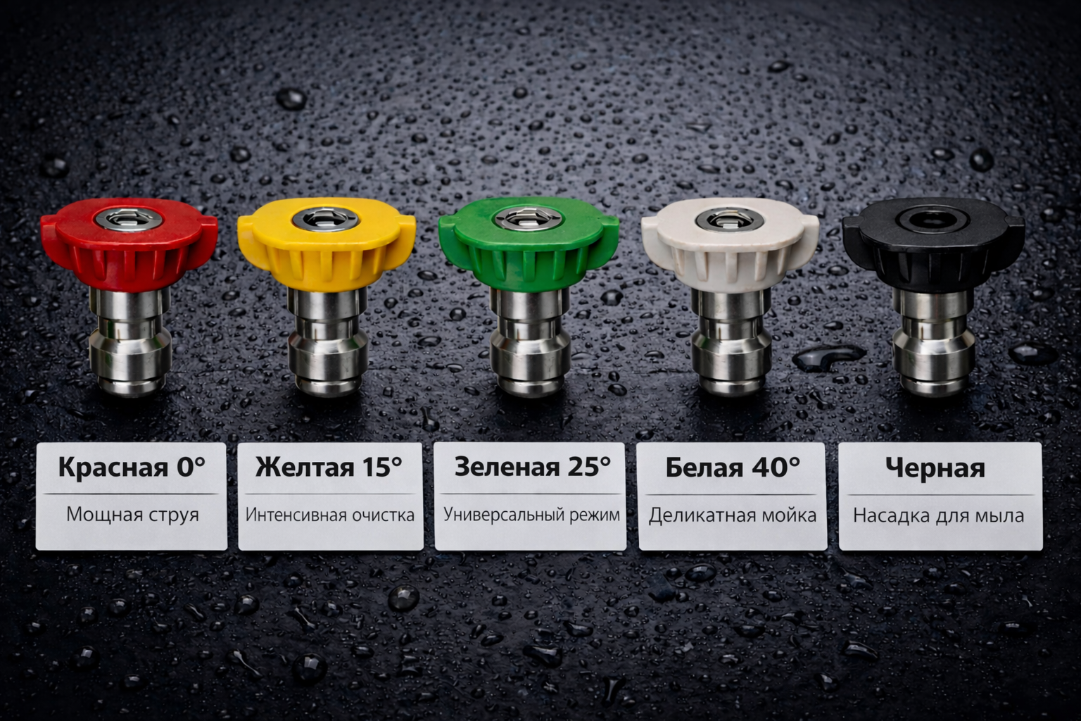 | Форсунки (5 шт.) | • красная — 0° (узкая струя, самая мощная) • желтая — 15° (интенсивная очистка) • зеленая — 25° (умеренная очистка) • белая — 40° (деликатная мойка и ополаскивание) • черная — насадка для мыла |