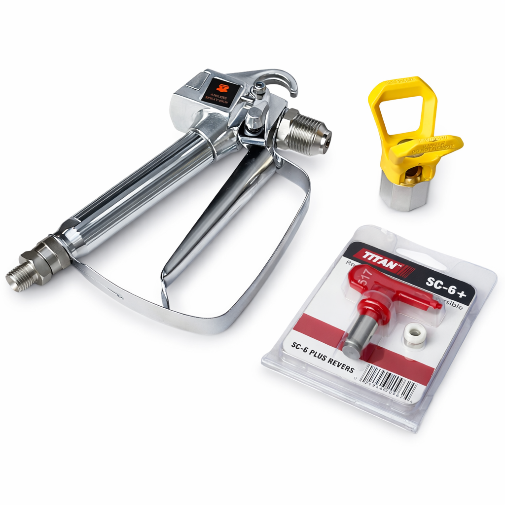 В комплекте – профессиональный безвоздушный пистолет, рассчитанный на давление до 248 бар (3600 PSI) , что обеспечивает точный контроль факела и уверенную работу без перегрузок. Удлинитель 30 см позволяет комфортно работать в труднодоступных зонах, а универсальное сопло 517 обеспечивает оптимальный баланс между производительностью и качеством нанесения.