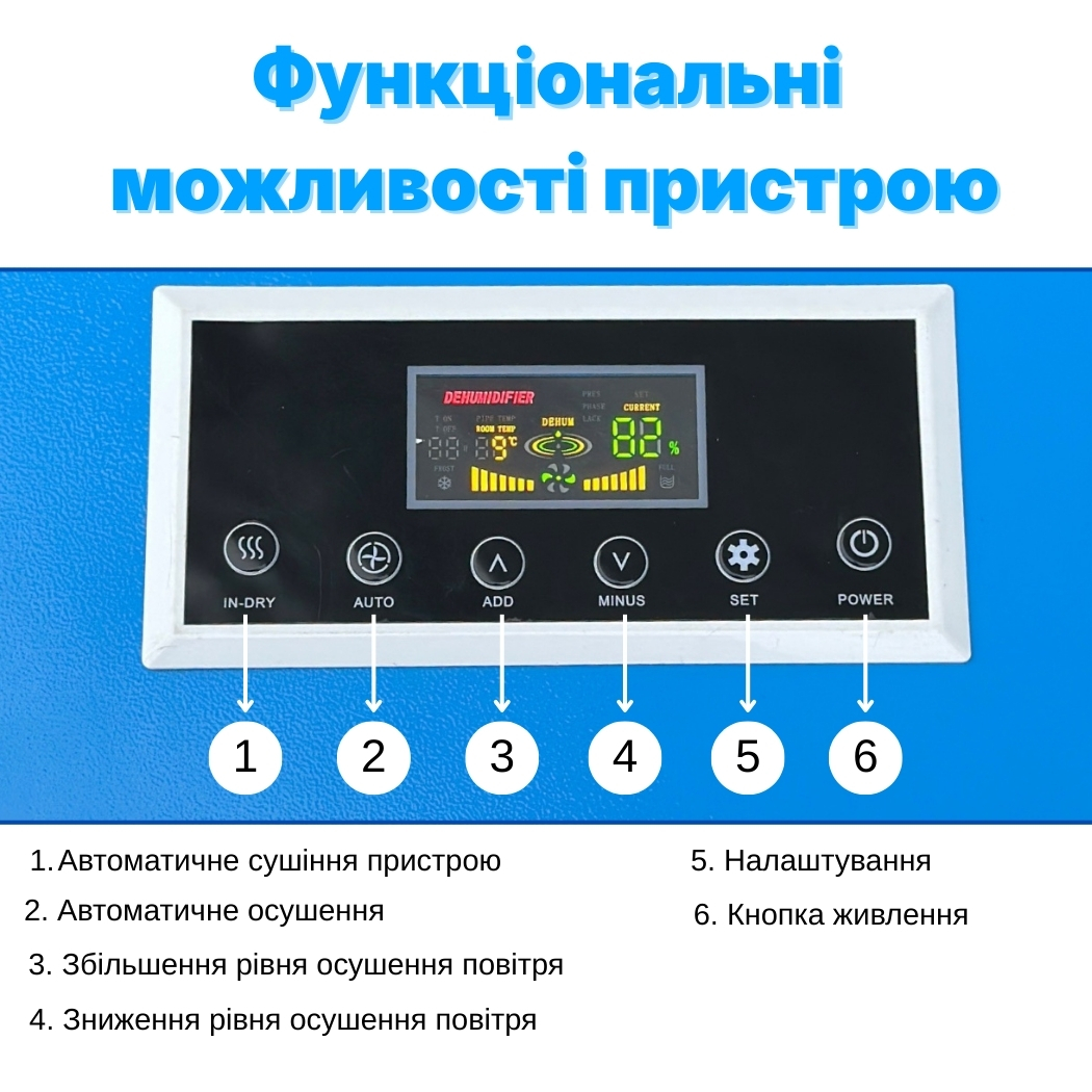 | Продуктивність осушення | 60 л/день (30℃, 80%RH); 31 л/день (27℃, 60%RH) |