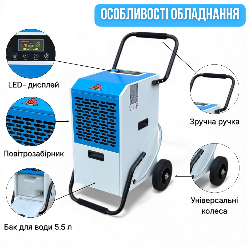 Потужна мобільна осушувальна установка Profinstrument HACD-60H здатна успішно впоратися з надмірною вологістю, видаляючи до 60 літрів конденсату за 24 години.