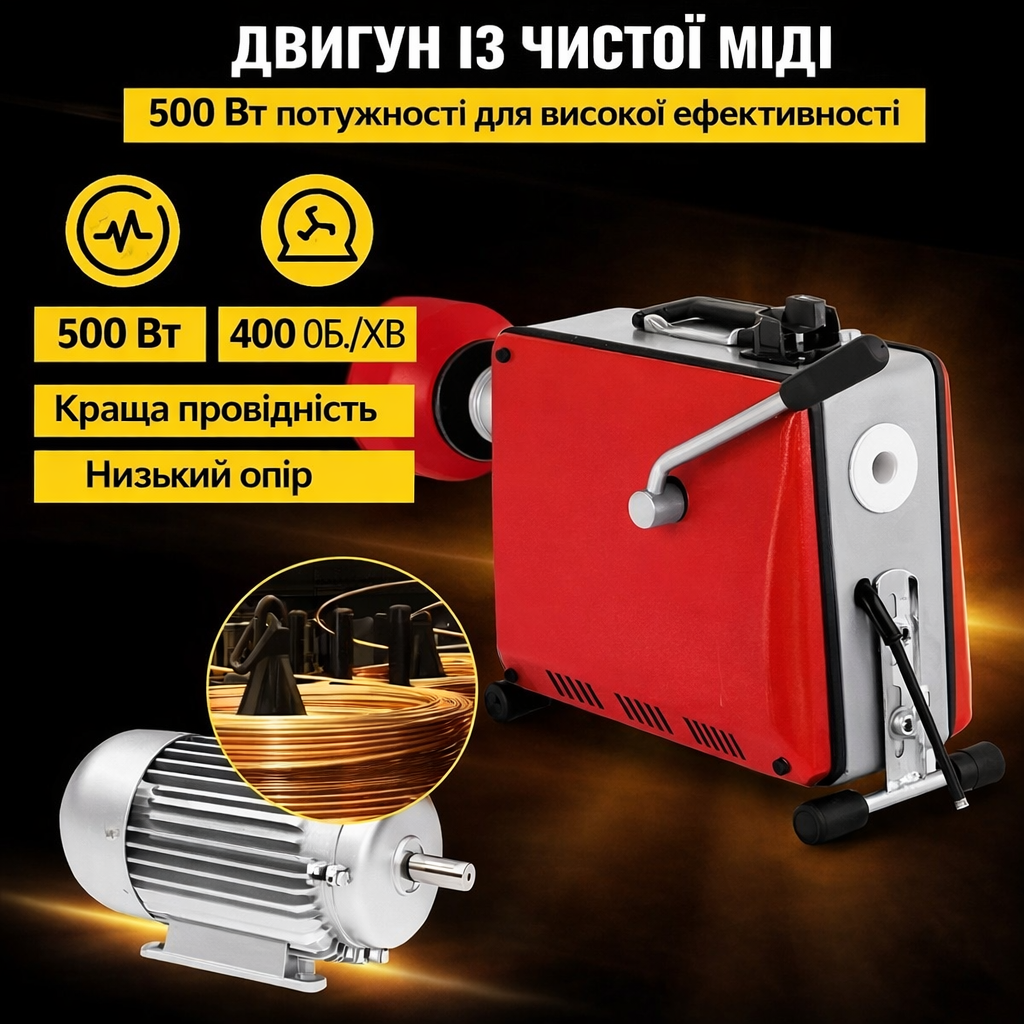 - Потужний двигун 500 Вт для ефективного очищення труб