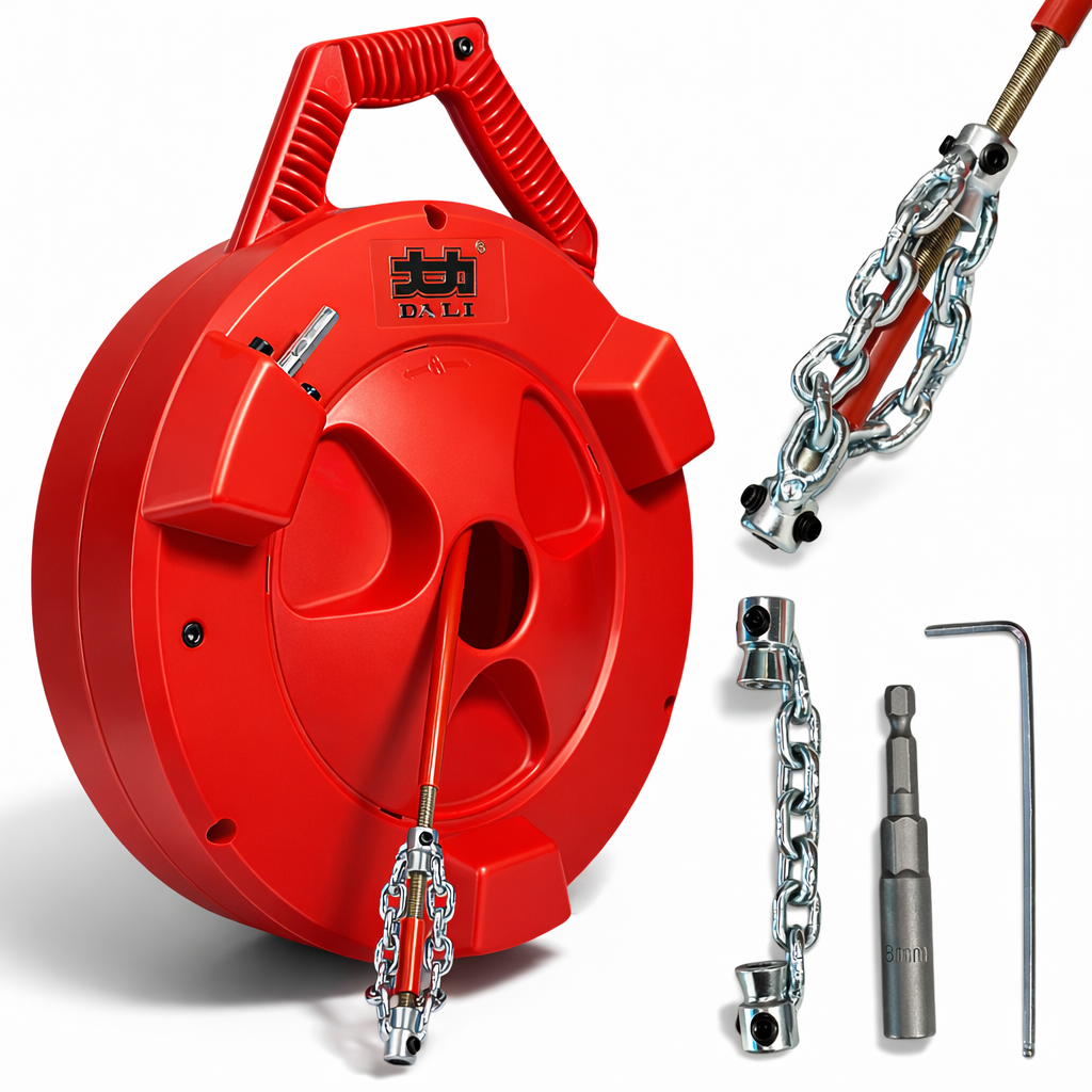 Апарат оснащений гнучким валом із ланцюговою насадкою, який приводиться в обертання за допомогою дриля зі швидкістю 1800–2500 об/хв. Під час обертання насадка ефективно руйнує жирові відкладення, наліт, органічні забруднення та інші побутові засмічення, що накопичуються на внутрішніх стінках труб. Такий принцип роботи дозволяє не лише усунути засмічення, а й очистити внутрішню поверхню трубопроводу.