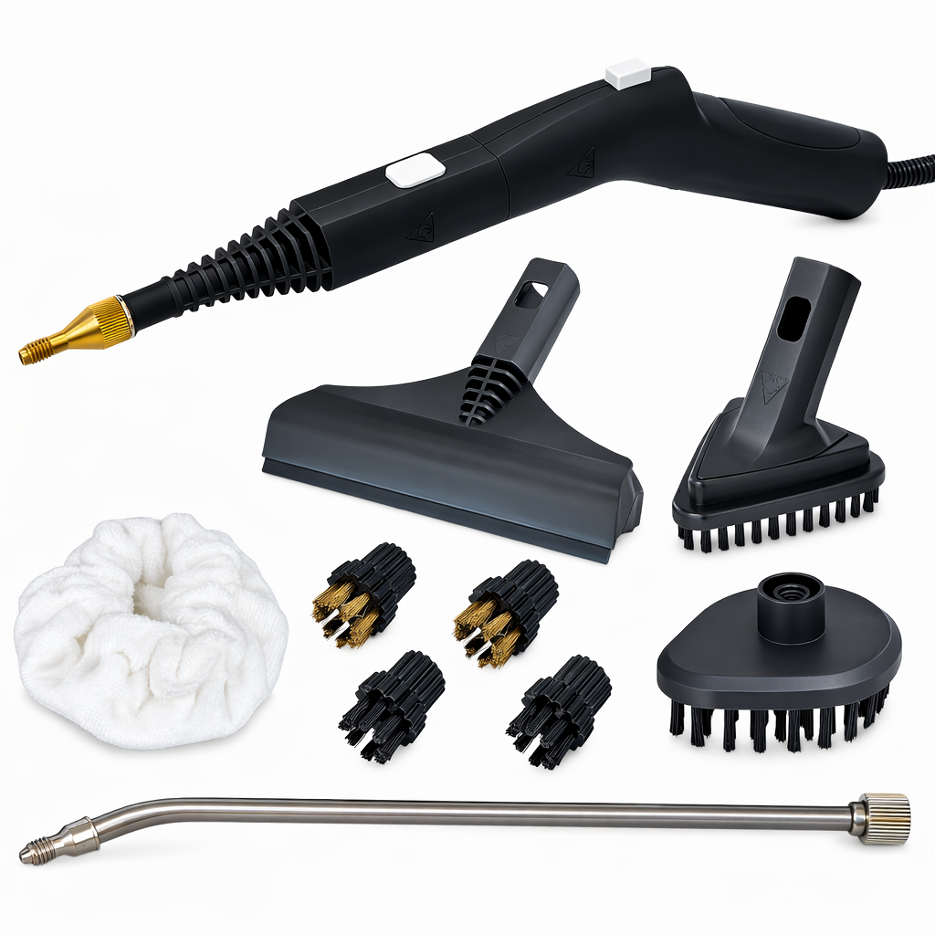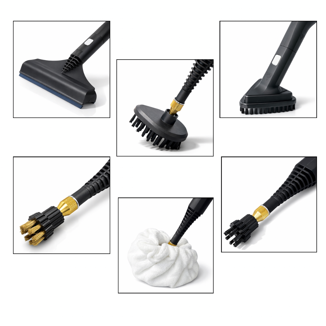 Пароочисник SX26-C комплектується набором різних насадок, які дозволяють ефективно очищати різні типи поверхонь — від плитки та сантехніки до скла, меблів і кухонної техніки. Кожна насадка має своє призначення, що робить пристрій універсальним інструментом для прибирання.