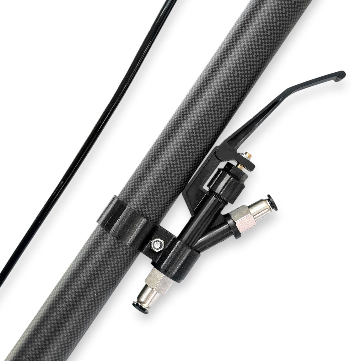 Металеві швидкороз’ємні конектори дозволяють швидко підключати шланг, а міцний кронштейн надійно фіксує систему на карбоновій штанзі. Вода подається безпосередньо до щітки, що забезпечує ефективне очищення поверхонь.