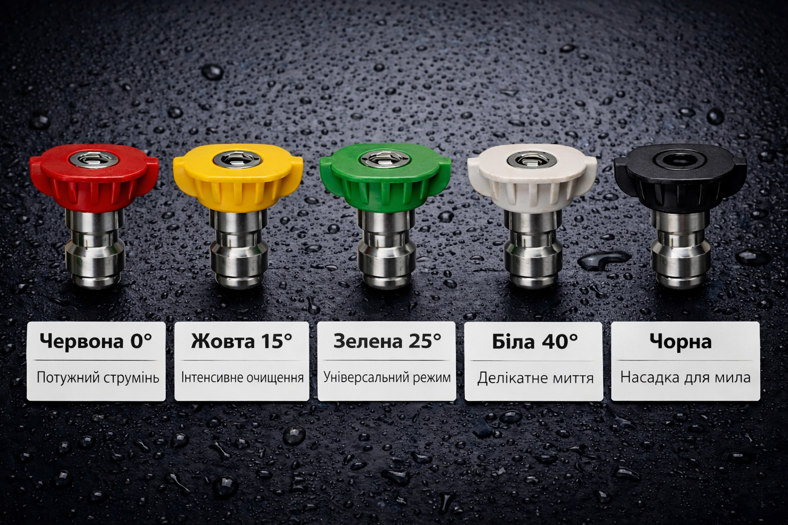 | Форсунки (5 шт.) | • червона — 0° (вузький струмінь, найпотужніший); • жовта — 15° (інтенсивне очищення); • зелена — 25° (помірне очищення); • біла — 40° (делікатне миття та ополіскування); • чорна — насадка для мила |