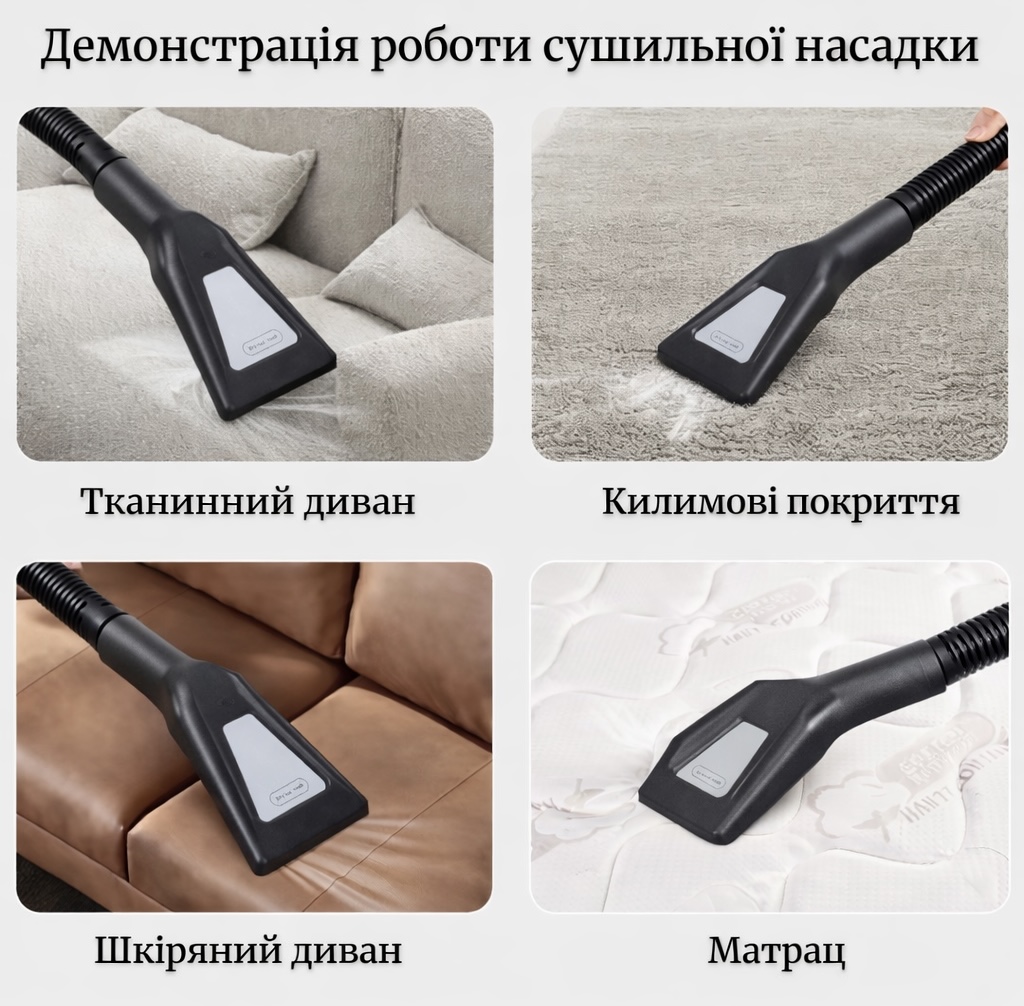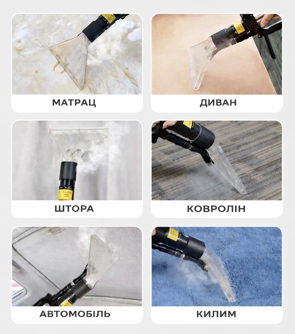 Апарат також широко застосовується у клінінгових компаніях для очищення м’яких меблів, килимів, сходів і комерційних приміщень, забезпечуючи стабільний професійний результат навіть при інтенсивному використанні.